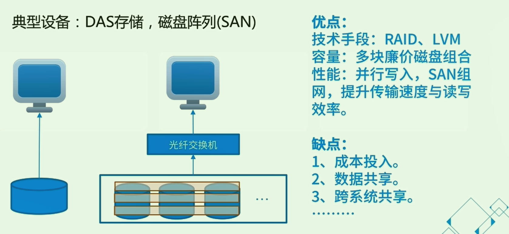 SAN: 磁盘阵列 ,将各种存储设备集中起来形成一个存储网络,以便于数据的集中管理 (不是NAS).需要购买专门的交换机(光纤卡,或者磁盘控制器,很贵)