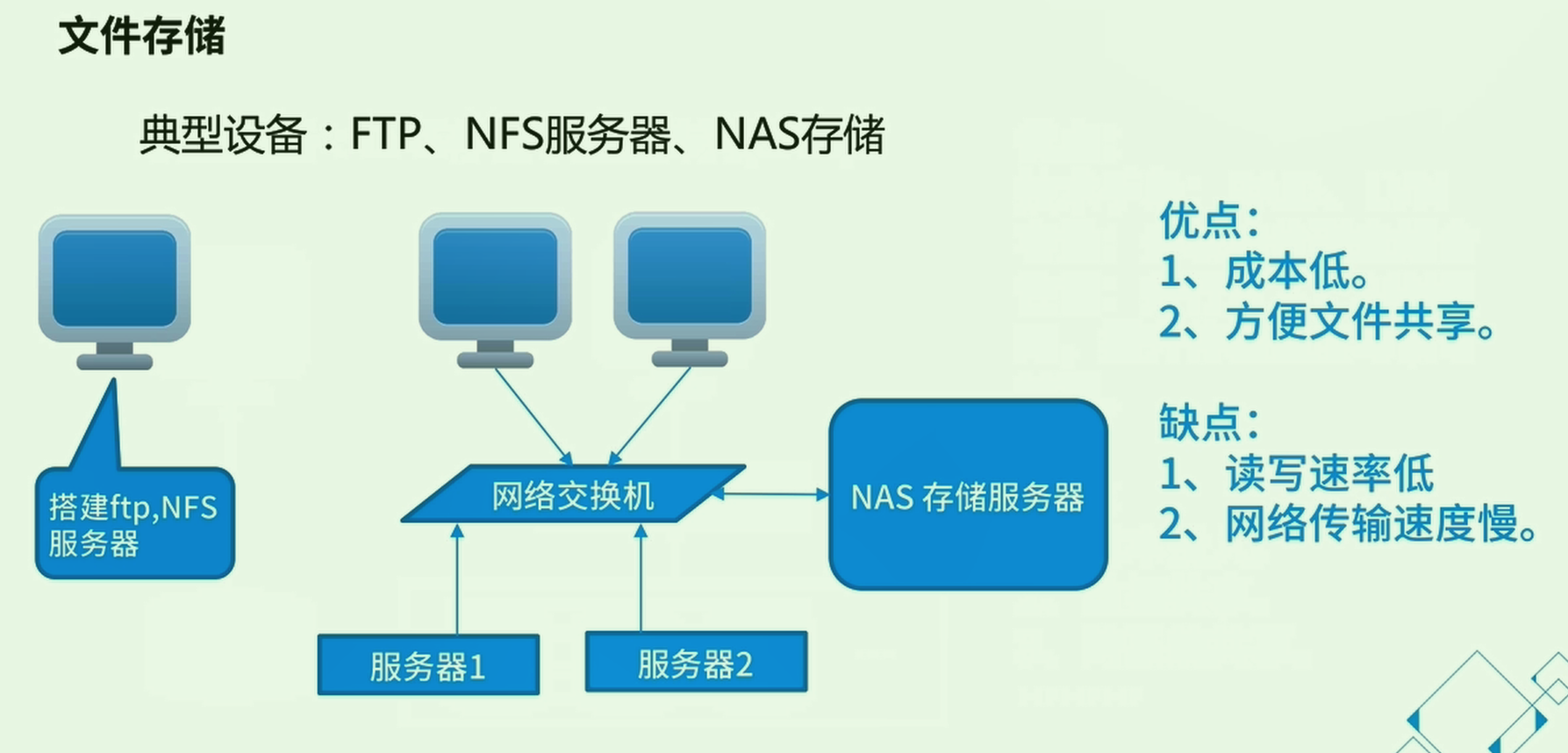NAS: NAS是中小型最常用的一种存储方式,一般NAS可以支持FTP,NFS,CIFS多种网络文件传输协议