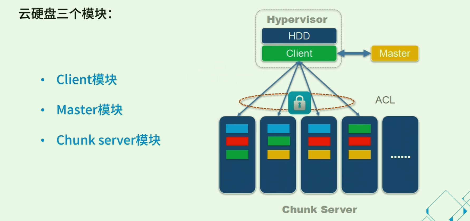 首先,数据模块是整个云硬盘的存储节点,负责管理分配数据块,保存真实数据. 每份数据冗余三份在不同节点上避免丢失.图中蓝色代表相同的数据快,红,绿,黄也是一样.