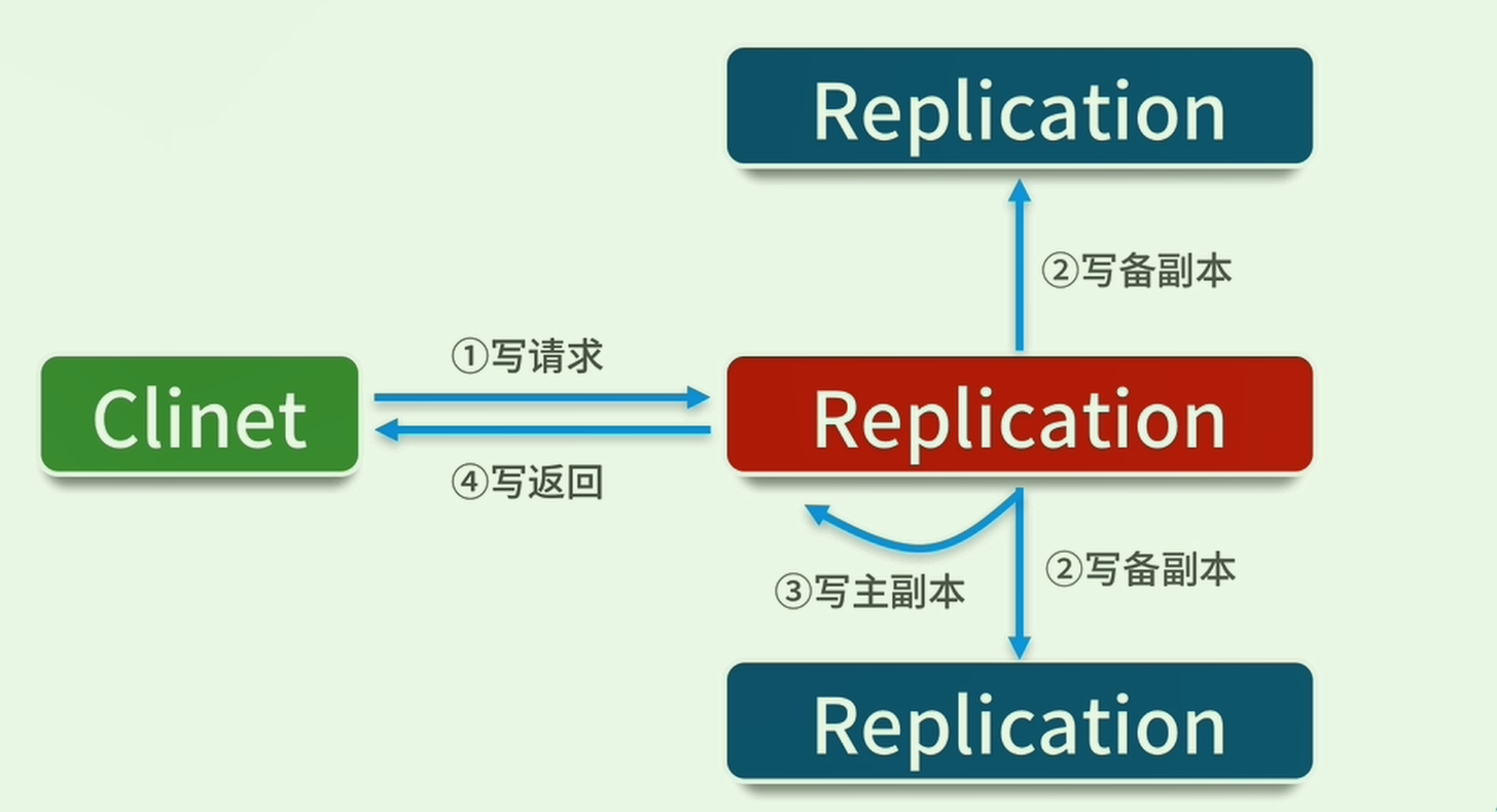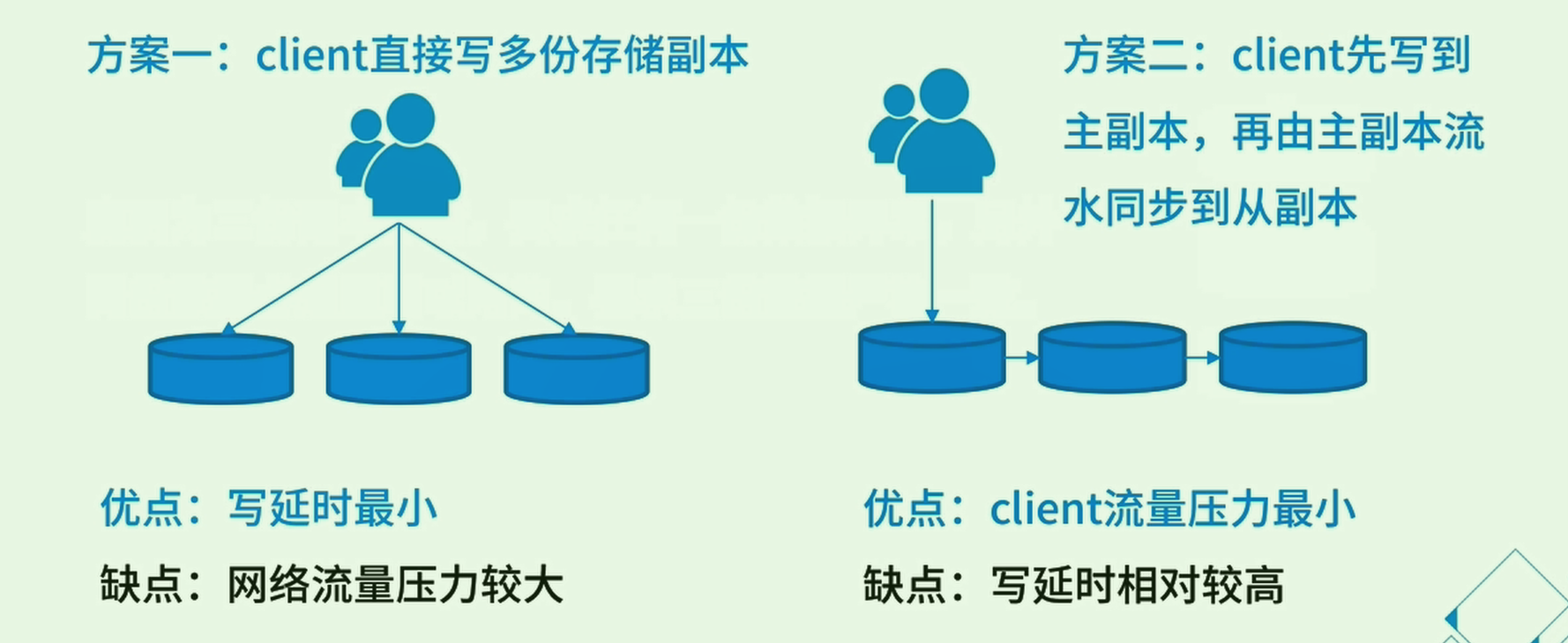 比较好想的就是,像raid1的思路一样,把一份数据同时写到多份数据区,直接写延时低. 缺点: 网络压力大
