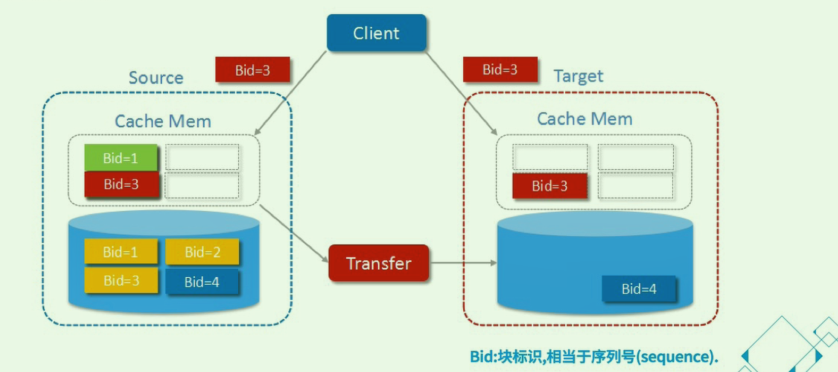 如果这时候用户有新的写入请求,本来会写到3个副本.但是这时候如果有一个已经故障了,那么显然就不能再写到它的数据区了. 会先暂存在它的缓存区 Cache memory.(本身数据也是先经过缓存,才会写入磁盘).在进行数据恢复的时候,会由后台进程对比故障节点与主节点的序列号. 如果序列号相同就不用恢复.反之如果如图中所示,一个bid=3 ,另一个bid=4 ,这个时候就需要进行恢复.