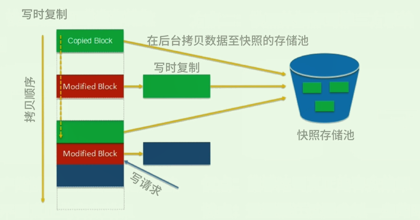 在用户选择创建快照之后,会在后端启动一个进程,以块为单位,把用户的数据拷贝到快照单独的存储区.为了保证用户点击完创建快照,到实际创建完成的时间点一致.采用了下面的两个技术点.
