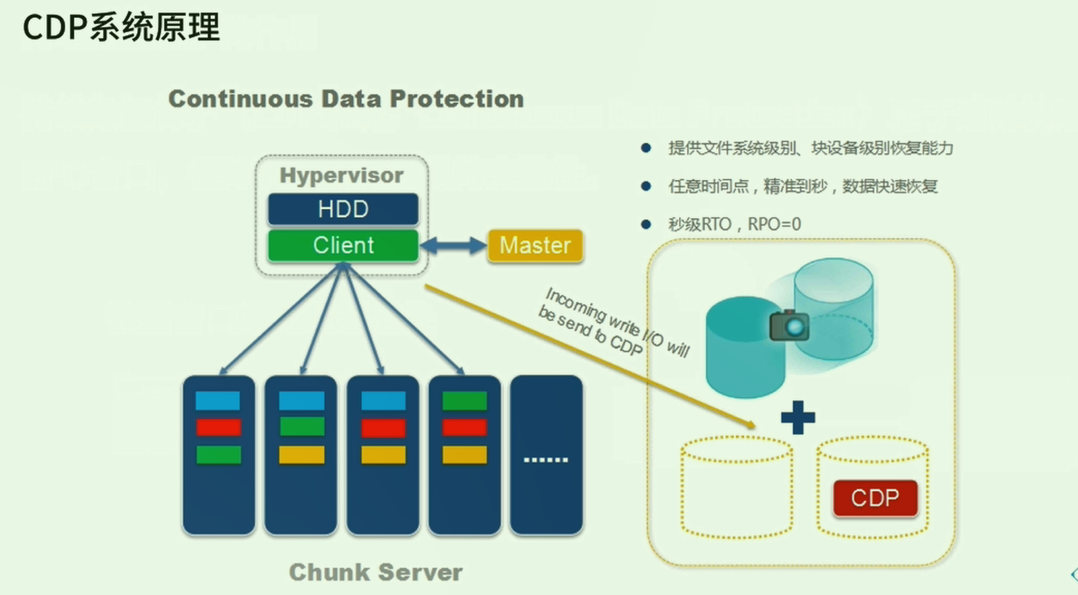 快照能在很短的时间内恢复到前一个时间点. 但是有个致命的缺点是在创建快照的时候,有个真空期(RPO窗口,这这期间是可能丢失数据的).那如果对高要求比如金融行业,为了避免这种问题.就需要引入CDP机制(Continuous Data Protection). 实现原理比较简单: 就是把所有用户请求同时发送到CDP系统.
