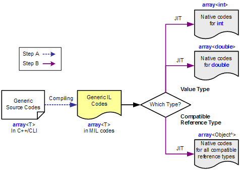C#结合了C++的宏式复制和Java的代码共享. 首先在编译时,c#会将泛型编译成元数据,即生成.net的IL Assembly代码。并在CLR运行时,通过JIT(即时编译), 将IL代码即时编译成相应类型的特化代码。