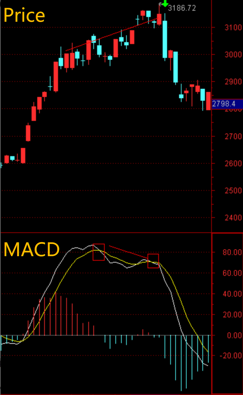 简单说, 股价上涨, MACD 指标却出现下跌 趋势就可理解为顶背离 (当然其他指标 RSI 等也是类似), 所以基础指标还是必须得了解含义的