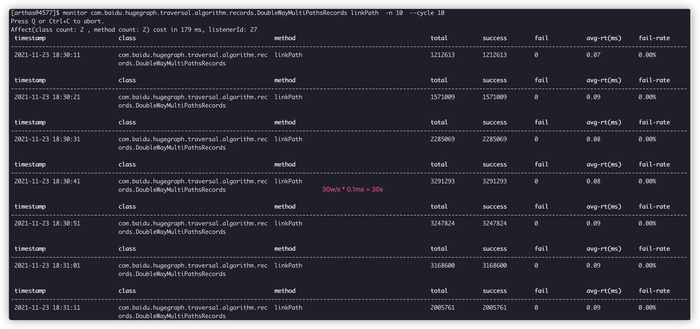 从 Arthas 的 monitor 可以很直观的发现, 单个 path-api 查询触发的递归linkPath()执行次数多达 30w/s, 而一次查询可能要触发几千万 ~ 上亿次的执行, 那么时间按照换算, 自然也就是 30s ~ 300s 了, 如下图所示: