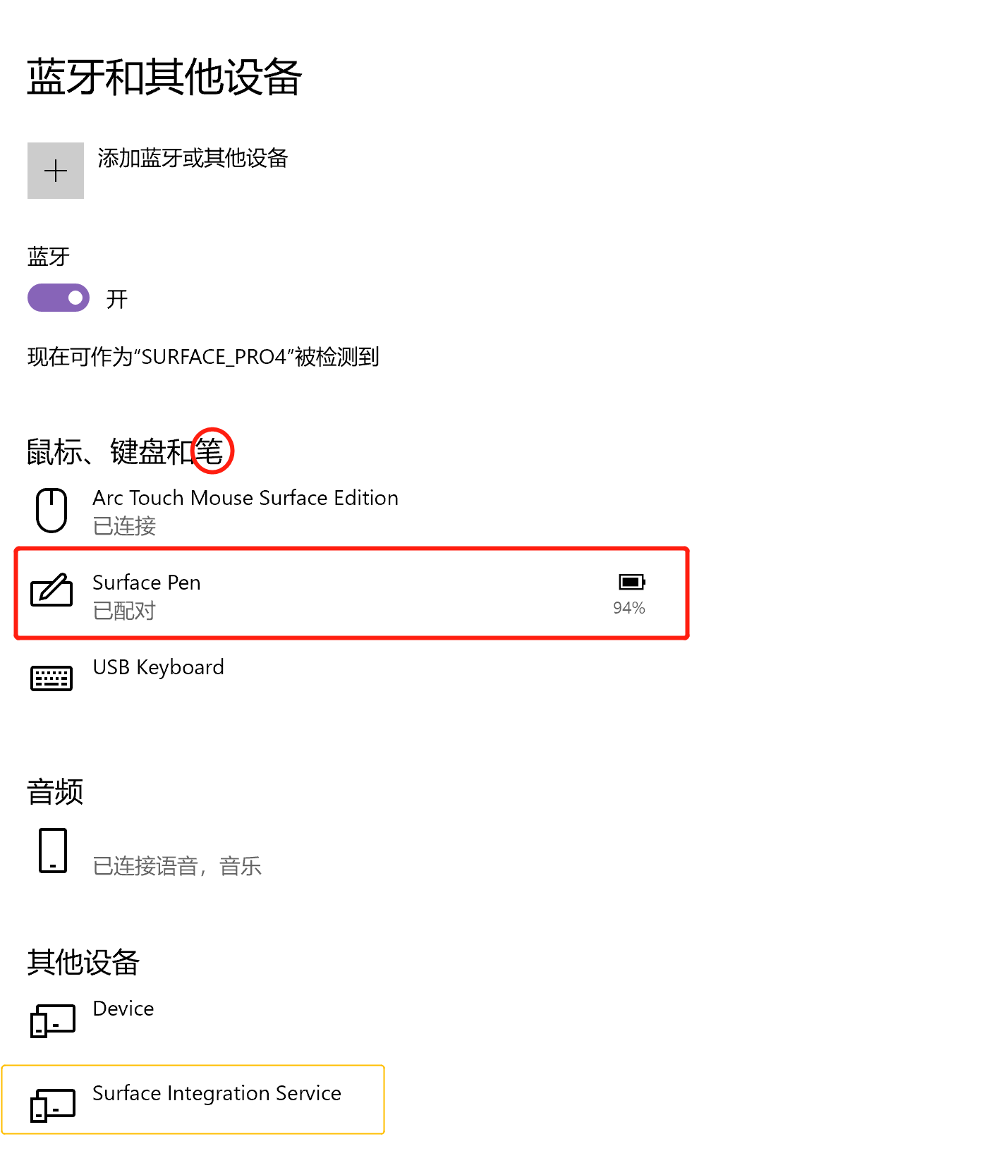 但是因为 Surface 家族的一贯”优良传统”, 它自然还有一些让大家比较抓狂的问题可能出现, 比如你可能会发现你初次配对成功, 显示在蓝牙里还是不能按键成功, 那多半是受到了上图”黄色框” (Surface Integration Service) 的影响, 你会发现此时 Surface Pen 显示在其他设备中, 而不是 “鼠标, 键盘/笔” 的栏目, 具体原因我不清楚. 解决方法是, 直接删除 Surface Integration Service ,然后你会发现笔的按键就秒正常了, 并且之后就回到了上面正常区域….. 而删除的这个Service, 它之后又会重新回来, 所以无需担心…