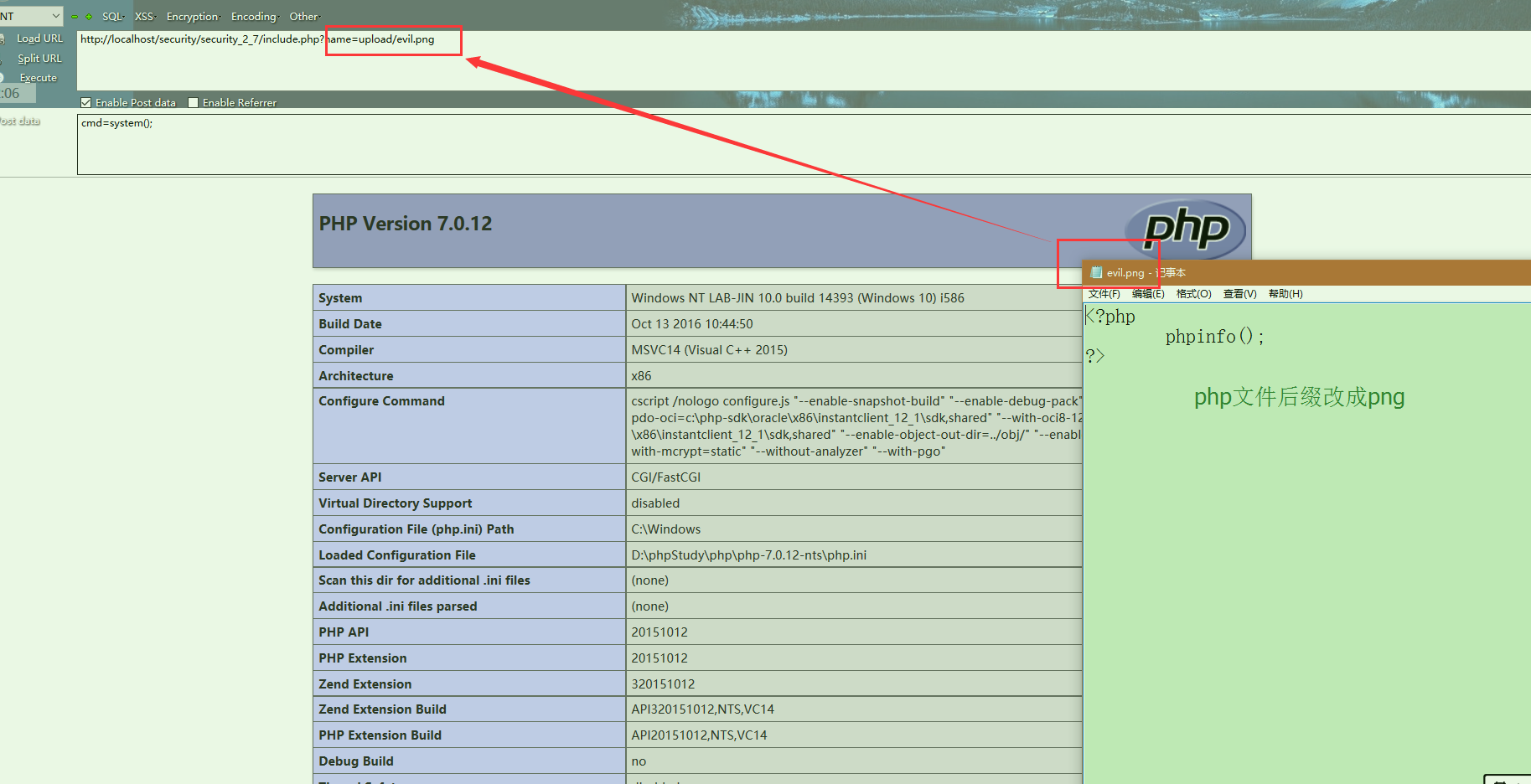 假设我们的利用文件是 evil.php ,里面写了一句话木马(phpinfo()~); 但是前端后端,甚至服务器端都会对文件的上传做严格的控制.下面说一下常见思路.