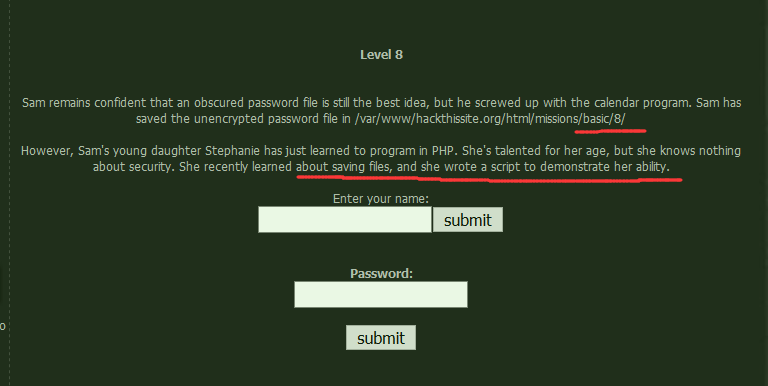 Sam is going down with the ship - he’s determined to keep obscuring the password file, no matter how many times people manage to recover it. This time the file is saved in /var/www/hackthissite.org/html/missions/basic/9/.