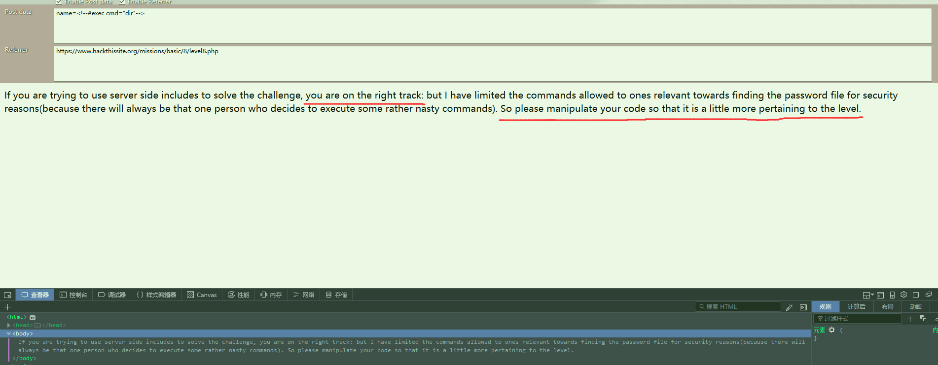 - 这题开始难度进入分割线了.需要使用html的技巧才能解决.题目有个submit可以提交信息,然后在php页面执行生成一份shtml文件后读取. 那么就关注一下shtml的特性. 以及参数name是否有命令的注入. 因为题目已经告诉你了flag所在的位置.